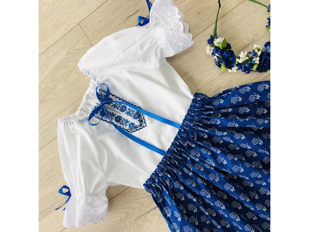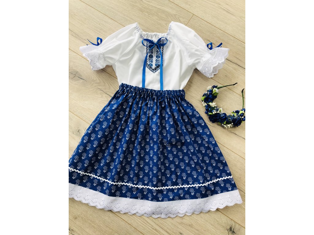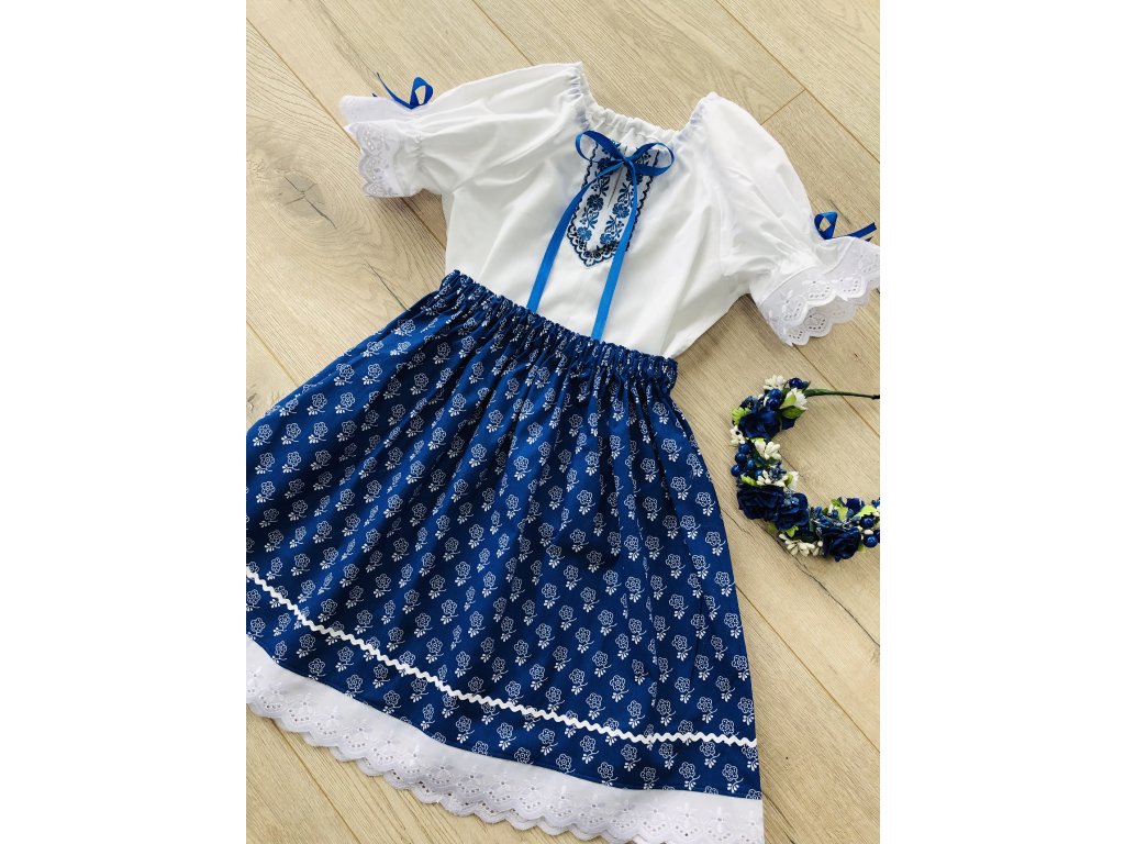 Komplet vo folklórnom štýle sa skladá z blúzočky zo 100% bavlny zdobenej krojovkou na rukávoch madeirou, sukničky - naspodu zdobená madeirou.