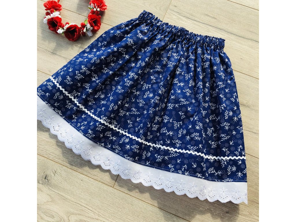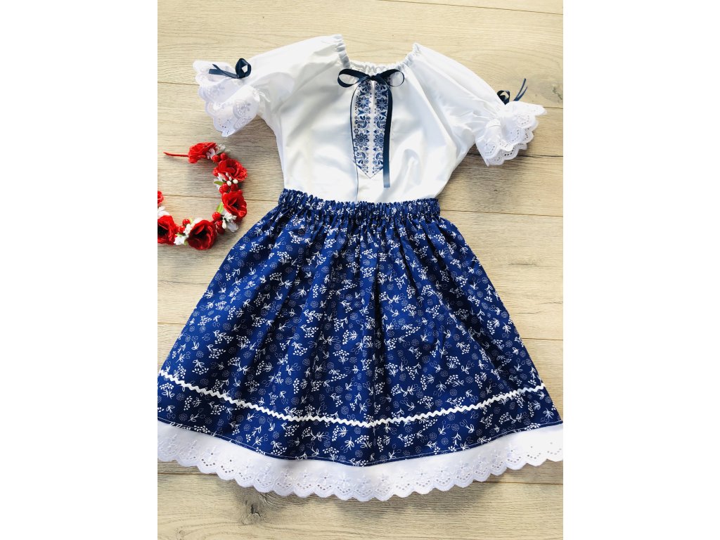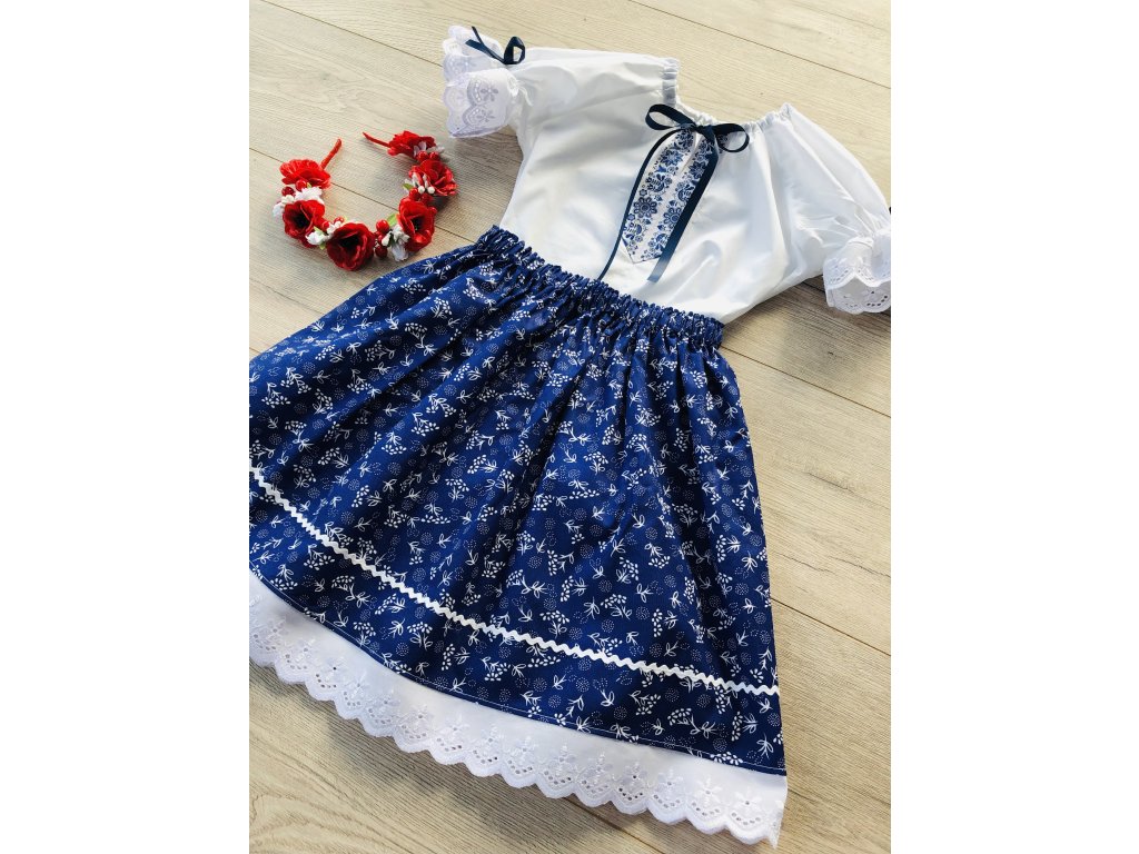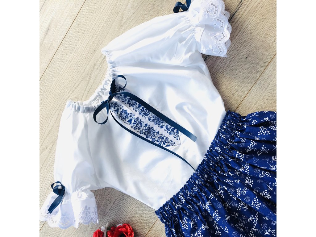 Komplet vo folklórnom štýle sa skladá z blúzočky zo 100% bavlny zdobenej krojovkou na rukávoch madeirou, sukničky - naspodu zdobená madeirou.