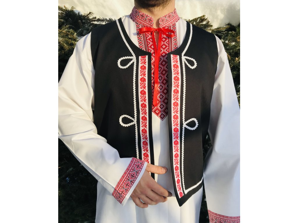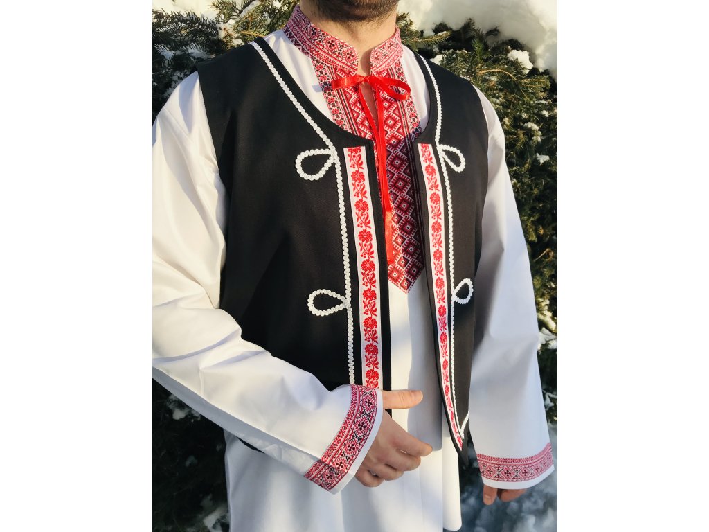 Vesta je ušitá z čiernej bavlny. Zdobená je krojovkou a hadovkou.