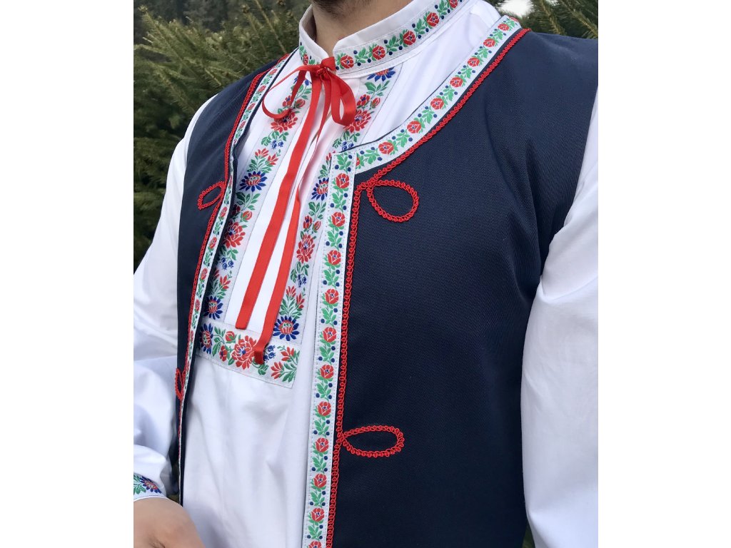 Vesta je ušitá z tmavomodrej bavlny. Zdobená je krojovkou a hadovkou.